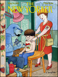 今天心血来潮,跑去艺术馆看展览。正在展出的有摄影作品、模型、实物、漫画,还有原住民海达文化木雕展,大部分我都不大能欣赏,或许是文化和年龄差异所致。原住民的木雕天然古朴,是我一向喜爱的。除此之外,有一位漫画家的作品吸引了我的眼球,他是六十多岁的纽约现代漫画家 Spiegelman。从1992年起,他在为《纽约人》杂志制作封面的十年间,有许多上乘之作、也带来很多争议,甚或他的有些作品被留而不发,说是内容太过离谱了。在读这段评论时,我不禁暗笑,西方民主社会,也并非言论完全自由,以往我只是泛泛地听说,很少遇到过这样的实例。